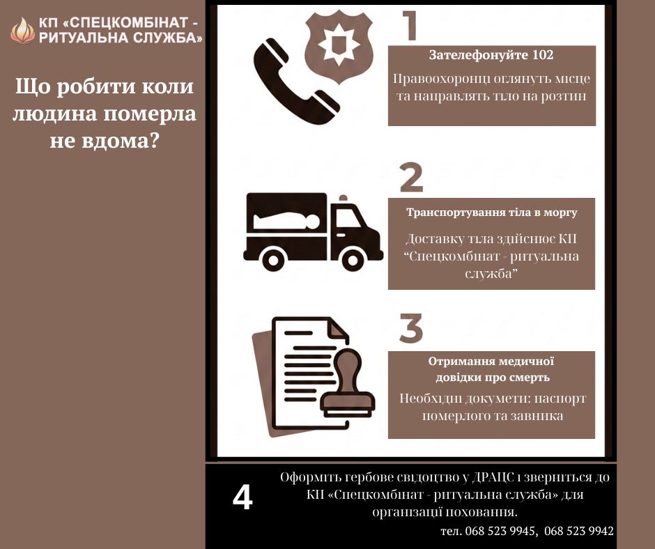 Після отримання гербового свідоцтва про смерть родичі можуть звернутися до КП «Спецкомбінат – ритуальна служба» для організації поховання.