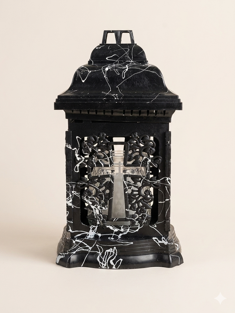 Виріб виконаний у класичній чотиригранній формі з масивним ступінчастим дашком та стійкою основою. Корпус виготовлений із пластику чорного кольору, декорованого контрастними білими лініями, що імітують текстуру натурального каменю або художні патьоки. Головним елементом дизайну є рельєфна лицьова панель у формі прорізного хреста, оточеного рослинним орнаментом, що виконує роль захисного екрана для скляної колби (вкладиша).